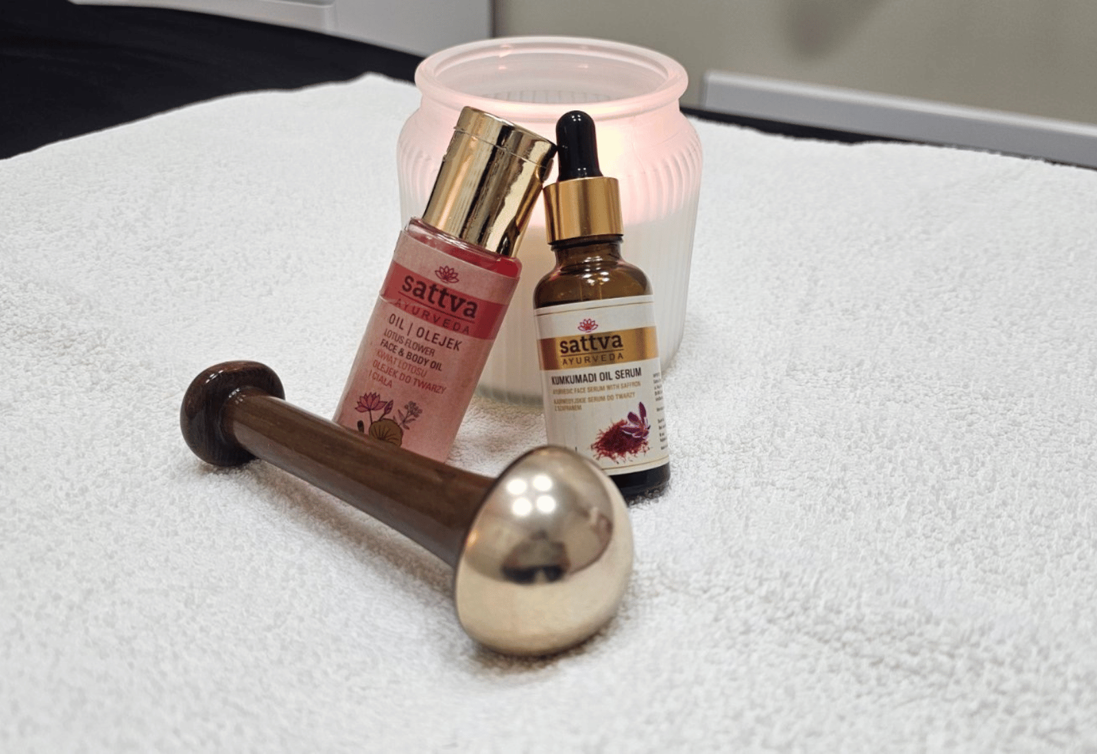 V salonu EnVivere masažo izvajamo z vrhunskim kumkumadi oljem – tradicionalno ajurvedsko olje na osnovi žafrana, sandalovine, lotosa in drugih zelišč, znano po svojih pomlajevalnih učinkih. Po potrebi uporabljamo tudi avokadovo, jojobino ali kokosovo olje, vselej s poudarkom na kakovosti in nealergenosti.